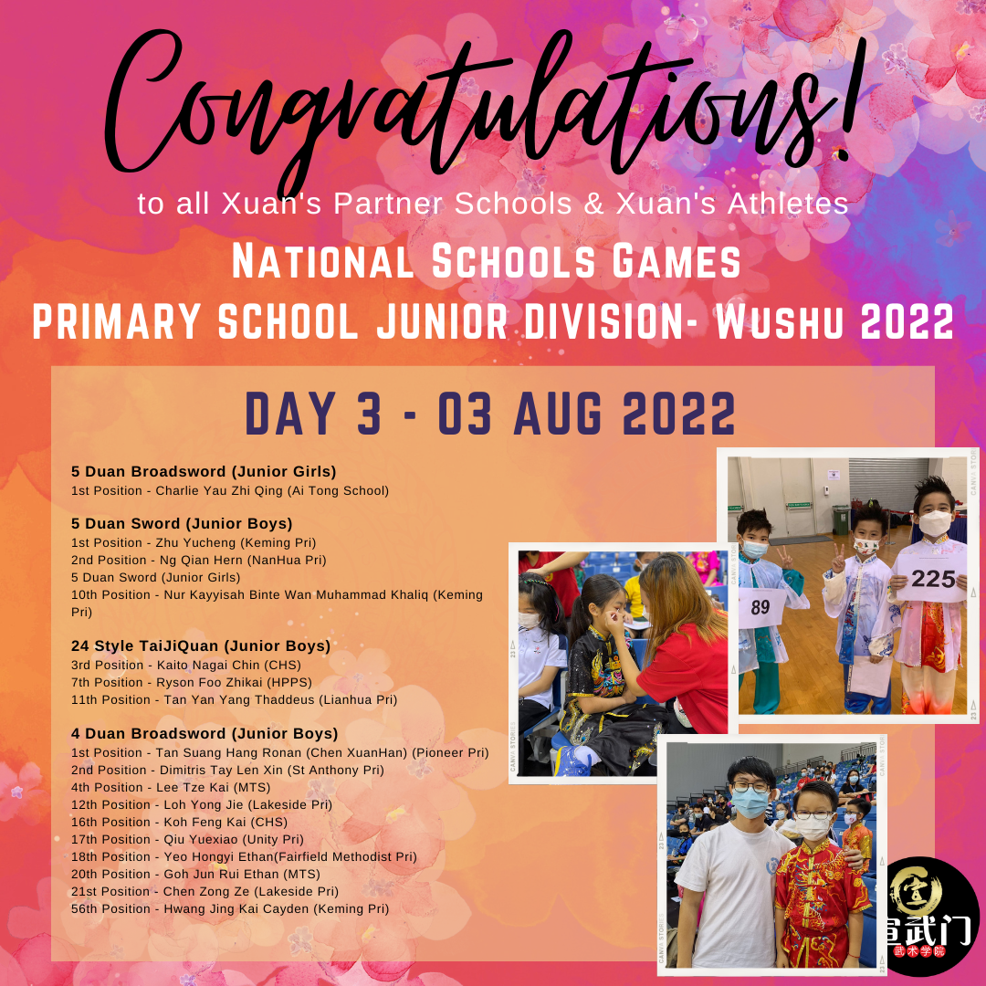 Congratulations to our winners (Our Schs and Xuan Athletes) for Day 3 of NSG Wushu 2022 (Pri Junior Division):