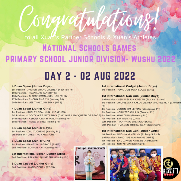 Congratulations to our winners (Our Schs and Xuan Athletes) for Day 2 of NSG Wushu 2022 (Pri Junior Division):NSG 2022 Junior DivisionDay 2 (2nd Aug 2022)4 Duan Spear (Junior Boys)1st Position -...