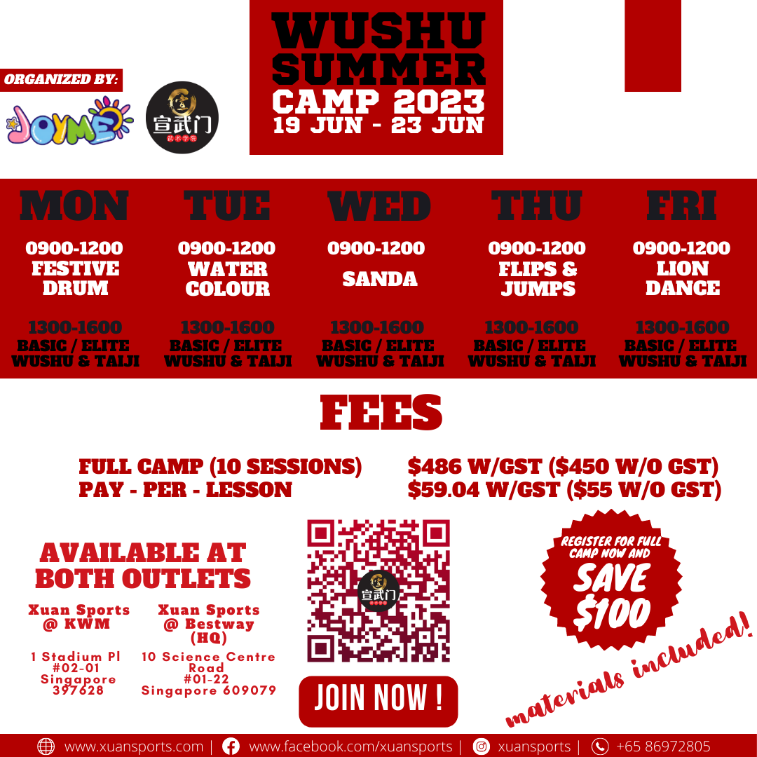 $450.00 Product not available Product InformationHighlights: SummerCamp 2023 (19Jun-23Jun) - Full CampStrictly no refundSubject to GST 8%Product SpecificationsVenue: Xuan Sports @ Bestway (HQ)